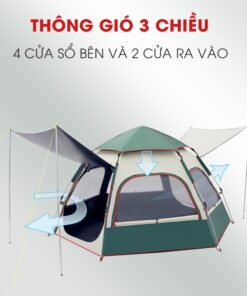 - Lều cắm trại có 6 mặt diện tích lớn, thoáng khí, thiết kế 4 cửa sổ và 2 cửa ra vào. Ngoài ra lều còn có lỗ thông khí trên nóc lều, giúp thông gió hiệu quả.