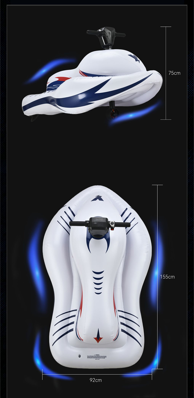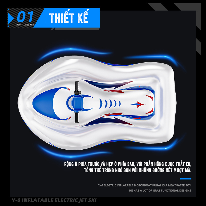Mô Tô Nước Bơm Hơi Cho Trẻ Em thiết kế rộng ở phía trước và hẹp ở phía sau, với phần hông được thắt eo, tổng thể trông nhỏ gọn với những đường nét mượt mà.