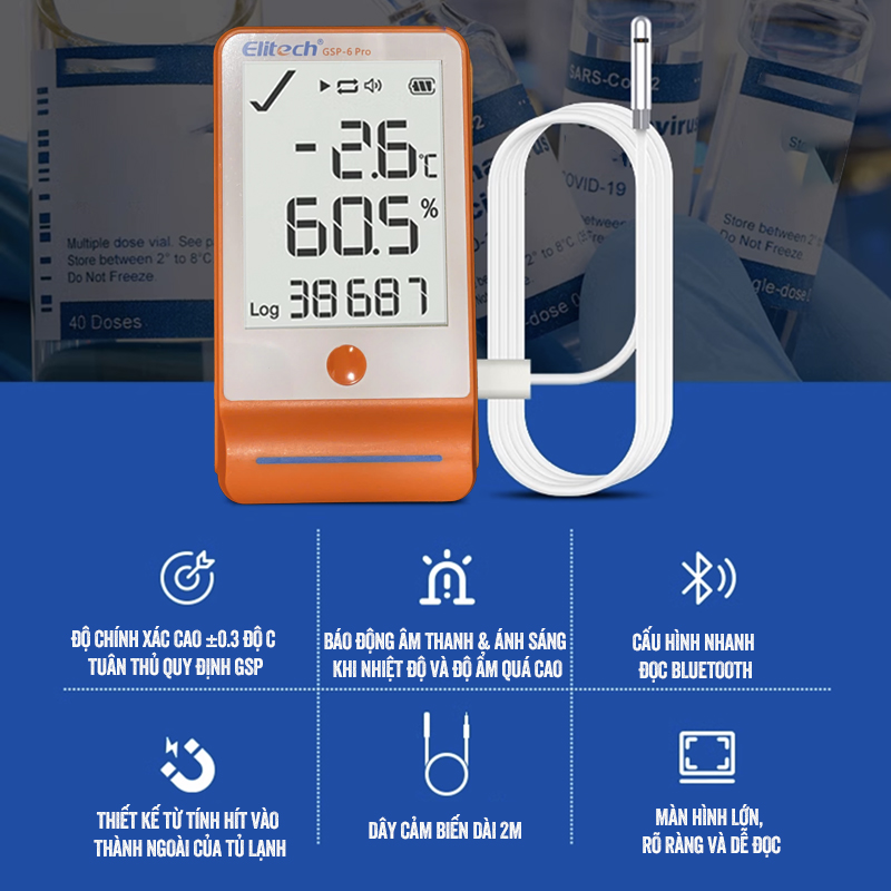 NHIỆT ẨM KẾ TỰ GHI Elitech GSP6 Pro Là thiết bị chuyên dụng trong đo ghi dữ liệu về nhiệt độ và độ ẩm của nguyên liệu; sản phẩm thực phẩm; dược phẩm; hóa chất của trong quá trình vận chuyển và lưu trữ,, hệ thống dây chuyền lạnh. Đặc biệt được các nhà thuốc; quầy thuốc; cơ sở kinh doanh dược phẩm tin dùng cho đảm bảo các tiêu chuẩn thực hành tốt bảo quản thuôc của Bộ y tế quy định.